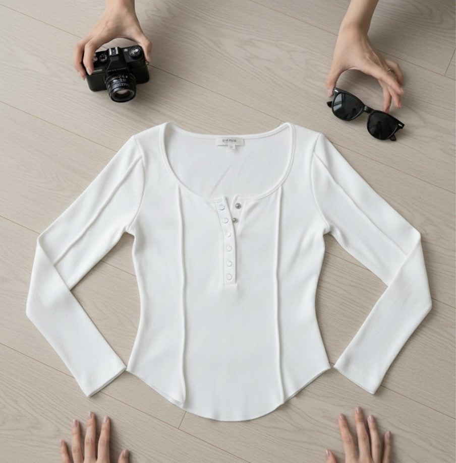 This chic Fitted Ribbed Henley Top offers a modern twist on a classic style, perfect for creating a sleek, sculpted look. Crafted from comfortable, textured rib-knit fabric, the top features a flattering scoop neckline and a central button-front placket in the iconic Henley design. Its figure-hugging fit is enhanced by distinct vertical panel seams that contour the body, while the curved, asymmetric hemline adds a contemporary finish that pairs beautifully with high-waisted denim